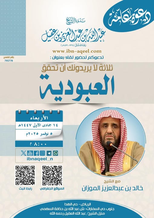 دعوةلحضوراللقاء(1)مع/الشيخ خالد_بن_عبدالعزيز_الموزان -في #ندوه_الشيخ_عبدالله_العقيل_رحمه_الله ???????? بعنوان ثلاثة لايريدونك أن تحقق #العبودية