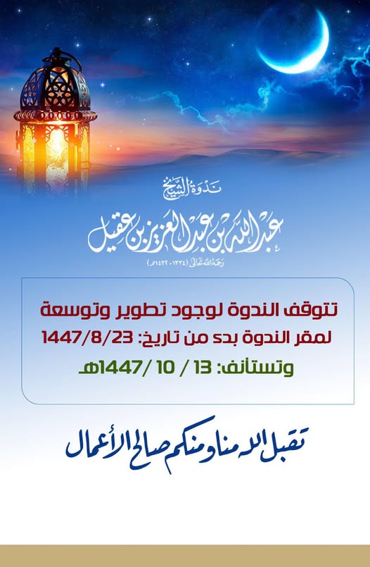 تتوقف ندوة الشيخ عبدالله العقيل رحمه الله يوم الاربعاء23-8 الموافق 11-2م لوجود تطوير وتوسعة في مقر الندوة وتستأنف ان شاء الله الاربعاء13-10 الموافق 1-4م