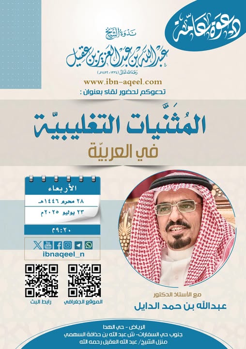 دعوة لحضور اللقاء (7)مع/ أ/ د/ #عبدالله_بن_حمد_الدايل -في #ندوه_الشيخ_عبدالله_العقيل_رحمه_الله بعنوان( #المثنّيات التغليبيّة في #العربيّة )