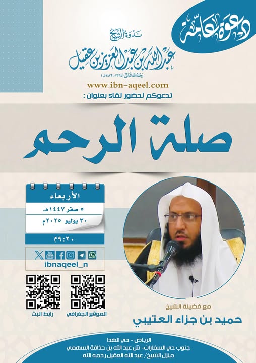 دعوةإلى حضوراللقاء(٣)مع #الشيخ #حَمِيد_بن_جزاء_العتيبي- في #ندوه_الشيخ_عبدالله_العقيل_رحمه_الله -بعنوان (#صلة_الرحم )