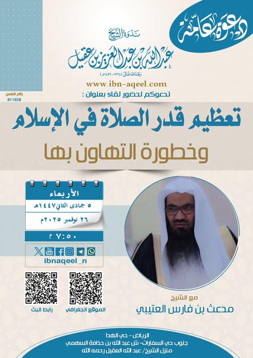 دعوةلحضورلقاءبعنوان(تعظيم قدرالصلاةفي الاسلام وخطورةالتهاون بها-الشيخ مدعث العتيبي